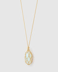 Enchanted style arrives with the luxe Lotus Necklace, a long chain beauty featuring a luminous stone wrapped in a netted golden design. Dreamy and eye catching, Lotus brings a touch of magic to any outfit, perfect for layering or shining on its own.