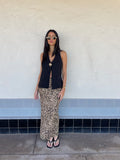 Meet the Gabriella Top, featuring a halter vest style top with an open v-neckline that drapes beautifully and is finished with a gold shell feature which completes the look with a touch of feminine charm. Pair the vest with the matching pant to complete the outfit.