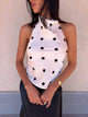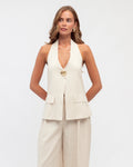Meet the Gabriella Top, featuring a halter vest style top with an open v-neckline that drapes beautifully and is finished with a gold shell feature which completes the look with a touch of feminine charm. Pair the vest with the matching pant to complete the outfit.