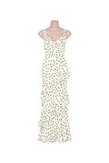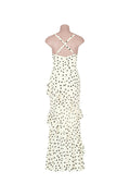 The Sabrina Dress is a gorgeous ruffle style maxi dress in a cream and black polka dot print. By showcasing a draped cowl neckline and adjustable cross straps at the back, finished with fitted waistline and frill details on bottom making it the perfect event dress.