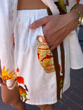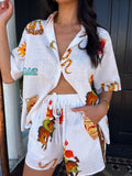 A breezy, lightweight two-piece set featuring a relaxed short-sleeve button-up shirt with a matching drawstring short. Made in a semi-sheer, linen-look fabric, this set is finished with playful, holiday-inspired illustrated prints (mermaids, horseshoes, waves, palm trees and more) scattered across a crisp white base.