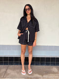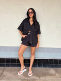 Introducing the Romy Set, a beautiful shorts and shirt combo in a classic black finished with white stitching, it's all you'll need this summer season. The shorts feature an elasticated waistband and a relaxed baggy fit. While the shirt has all the classic shirt features in a boxy relaxed style for ultimate summer comfort.