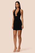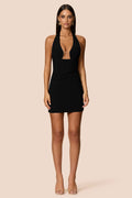 Signature Nookie styling with ultra fitted body and sheer mesh at front bust. Flattering tucks at side waist, halter ties at back neck and invisible zip at back. Fully lined.