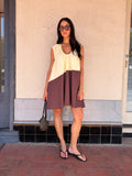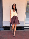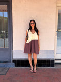 The Valerie Mini Dress is a style that has elegance and class in a relaxed and comfortable Fit. This dress showcases a rounded gathered neckline with thick straps and a relaxed baggy fit, finished with a yellow and chocolate two colour tone. It's the perfect dress for any event.