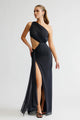- Floor length dress with cutaway split