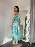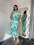 The Ciara Dress is a gorgeous silky style midi dress in an aqua water colour floral print that screams elegance. By showcasing a draped asymmetrical off-shoulder neckline, an a-line cut with leg split and a fitted waistline finished with a thin belt. It's the perfect dress for any event.