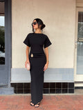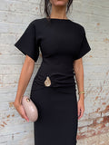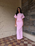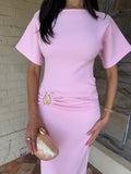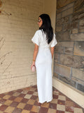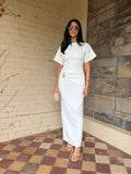 Meet the Saba Midi Dress, an elegant and timeless midi dress that features exaggerated short sleeves and a gathered band with a statement gold buckle. It screams effortless class which makes this style the perfect dress for any event.