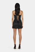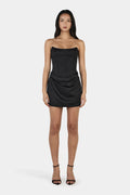 The Angelica Dress is a structured strapless mini featuring a corset-style bodice with internal boning for a snatched shape. It’s designed with a soft scooped neckline and lace-up detailing at the back for an adjustable fit. The draped skirt falls from the waist with a subtle front cowl detail. Fully lined and finished with an invisible side zip for a seamless silhouette.