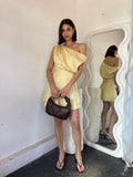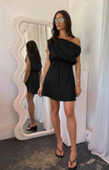 The Ciara Dress is a gorgeous silky style mini dress in a deep chocolate brown that screams elegance. By showcasing a draped asymmetrical off-shoulder neckline, a-line cut and a fitted waistline finished with a thin belt. It's the perfect dress for the summer season.