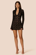 Amazing mini dress with plunging neckline and wide sleeves. Crafted in our semi-opaque stretch lace, this mini fits like a second skin. Hook and eye closure at neck for a 2-way look. Invisible zip at back, body is lined.