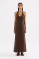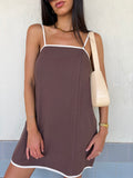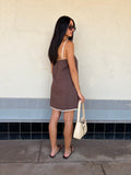 Meet our Nicola Dress, a breezy long mini style designed for warm days, coastal escapes, and effortless everyday style. Crafted from a lightweight denim fabric in a deep chocolate brown finished with cream outlines and thin adjustable straps. This style meets comfort and chic simplicity.
