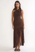 Meet the Solana Maxi Dress, designed to scream elegance and turn heads. This piece features shimmering chocolate-brown mesh throughout its sleek silhouette. An asymmetric neckline with a halter knot detail adds a refined touch, while the open-leg, flowy skirt ensures striking movement.