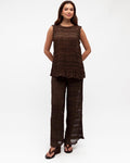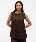 Meet the Cleo Sleeveless Top, crafted from a lightweight and softly sheer fabrication and delicate horizontal pleat detailing throughout. The subtle texture creates beautiful dimension, while the relaxed silhouette drapes gently over the body for a flattering fit. Designed with a high neckline and soft trim perfect for both everyday styling and special occasions Style with the matching pant for a refined, coordinated set.