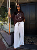 A relaxed-fit, deep chocolate brown and white graphic tee featuring an illustration of a tanning beds, palm trees and holiday vibes. Finished with white lettering reading “Hotel Soleil”, this tee brings a fun, carefree vibe with a vintage-inspired feel.
