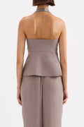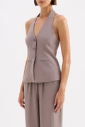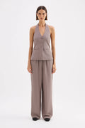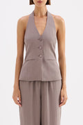 The Scarlet Vest is made from a lightweight viscose linen blend fabrication which has a soft hand feel with subtle texture. This tailored vest features a halter neck, v neckline, faux welt pocket, adjustable button closure at back neck and button front opening. This vest is fully lined. Wear on its own or pair with Nude Lucy essentials.