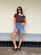 The Vanessa Stripe Knit Top is a gorgeous baby blue and chocolate stripe tee that features short sleeves, a relaxed boxy fit for ultimate comfort and finished in a soft knit material. It's versatile tee that is perfect for the tran-seasonal weather.