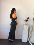 The Eclipse Maxi Dress is a sleek, one-shoulder, black maxi with white polka dots and a cinched waist. An effortless chic style that is perfect for any event.