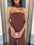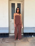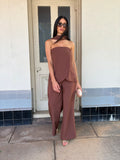 The Delilah Set is an effortlessly chic design, featuring a strapless top with an attached scarf detail, that's paired with a high waisted suit style pant with wide leg design. The top is finished with a swooped relaxed fit that drapes on the body for a soft feminine design. Perfect for all event for an elevated look to a timeless style.