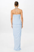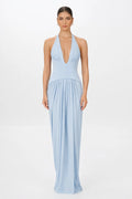 The Landon Dress is crafted from a soft stretch jersey that moves fluidly with the body, draping into a floor-length silhouette that commands attention. The deep halter neckline frames the décolletage while structured paneling contours the waist in a thick crepe for a sculpted fit. A subtle front split reveals the leg with effortless grace, balancing allure and sophistication.