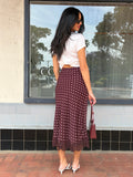 A playful classic with a romantic twist. This burgundy/pink polka dot midi skirt features a sleek silhouette finished with a delicate scalloped lace trim along the hem, adding just the right touch of femininity. Designed for comfort and ease, it includes a side zipper for a smooth, seamless fit and an non visible elastic waistband.