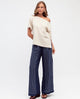 Elevate your everyday style with these effortlessly chic wide-leg pants. Crafted in a rich blue-nuse hue, this relaxed silhouette features a striking geometric stripe pattern that elongates the legs and adds a modern, sophisticated touch. The soft, lightweight fabric drapes beautifully for all-day comfort, while the elasticated waistband with an adjustable drawstring ensures a perfect, personalized fit.