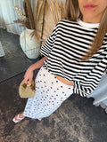 Effortlessly chic and perfect for warm-weather styling, this two-piece set features a relaxed striped tee paired with a flowy sheer maxi skirt. The soft, oversized tee brings a casual balance to the delicate, semi-sheer skirt adorned with playful polka dots. Lightweight, comfortable, and easy to style -wear it together for an instant outfit or mix and match with your wardrobe staples.