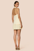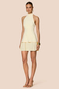Flirtatious and fresh. The Darling Mini combines clean lines with a soft pleated hem for playful movement. A bonded crepe halter bodice with side boning and pleated mini. Back neck closure with covered buttons and CB logo zipper.