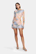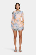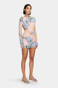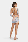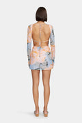 The Amber Mini Dress is a long sleeve mini dress with a wide scooped neckline and an open back. The dress is fully lined in the body with unlined sleeves that are slightly sheer.