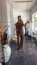 DETAILS- Two-piece set: halter top & lace pants- Draped halter neckline- High-waisted, wide-leg lace pants- Lightweight- Flattering, elegant silhouette Available in chocolate brown & White Model wears a size S