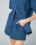 Introducing the Hunter Denim Shorts, a beautiful shorts and shirt combo in a dark indigo denim, it's all you'll need this summer season. The shorts are high waisted and feature a front zipper with button up and a relaxed baggy fit. It's the ultimate summer comfort.
