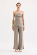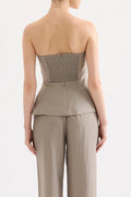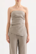 The Juno Bodice is made from a lightweight viscose linen blend fabric which has a soft hand feel and a subtle texture. The silhouette is a strapless fitted bodice with length finishing below the hip.. Features include shirring at the back, invisible zipper, gathers through waist, side split and asymmetrical hem.