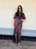 Flirt with versatility in the Part Time Lover Skirt, a satin stunner that transitions seamlessly from day to night. The rich chocolate palette pairs beautifully with a sultry black lace panel that hugs the hemline, adding just the right amount of edge. Dress it up with heels and a silky top for evening allure, or keep it casual with sneakers and a tee for effortless weekend vibes.