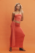 The Saskia Maxi Skirt is a maxi length fit and flare skirt. The skirt features a flattering ruched design with a faux tie detail at the front waist. Fully lined in the same fabric for a sleek silhouette. Pair with the matching Rihannon Top for a complete look.
