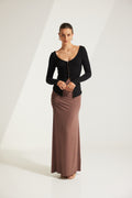 The Rylan Top is a versatile long sleeve style that showcases a centre hook-n-eye front closure and an open neckline that adds a touch of edgy elegance. It offers a comfortable fit with excellent durability and a soft, luxurious feel.