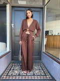 Meet our Roma Pant, this relaxed fit chocolate satin pant is a versatile wardrobe staple. Featuring a long straight leg with slight flare style, functional pockets and elasticated waistband with drawstring. Perfect for work or elevated casual looks, this pant pairs seamlessly with tops, blazers and knitwear.