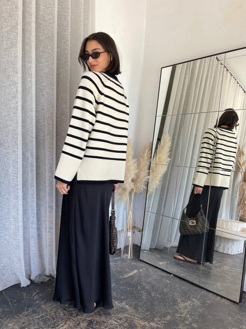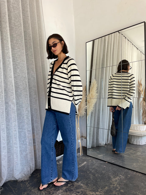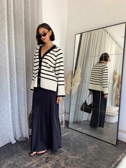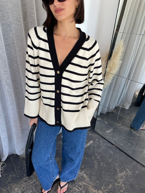 The Hedi Cardigan is a classic style that is perfect for the Autumn/Winter season. The cardigan features a soft fabric in a cream and black stripe, v-neckline and finished with...