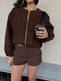 The Jennifer Bomber Jacket in charcoal grey or chocolate brown is a versatile style that elevates any outfit with ease. It features a sleek front zip closure, nonfunctional pocket detail and a bubbled waistband that brings in a more snug fit while added a gathered look. Finished with an open round neckline and bubbled elasticated cuffs for an edgy relaxed style. Perfect jacket to have in your wardrobe all year round.