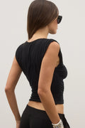 The Juniper Top is a sleeveless, fitted style designed with a high neckline and subtle draping through the front. Finished with ruching through the waist for a close, contoured fit. Cut to sit at the waist with a clean back and minimal detailing.