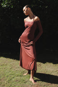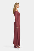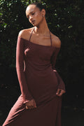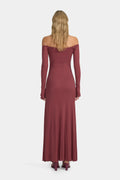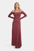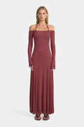 The Karina Dress is a fitted long sleeve maxi dress featuring a bralette overlay detailing on the shoulders. The bralette straps are adjustable and the dress is fully lined. Both the bottom and the sleeve cuffs feature a baby lock hemline.