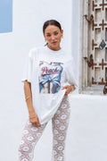 Our best selling tee by Peach & Parla has now arrived in a new vintage black wash print. The oversized tee with a high crew neckline and flirty peaches card print at the front is the ultimate styling piece for your wardrobe.